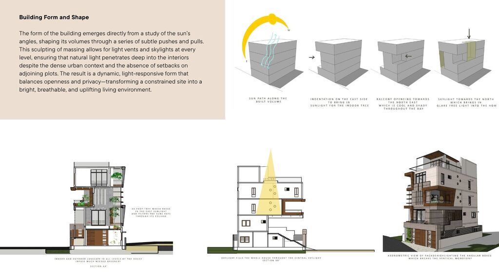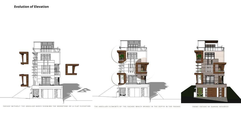 The façade design introduces an element of visual movement and playfulness. Instead of a static elevation, we wove asymmetric box-like forms at the lateral ends, stacking and growing vertically to create intriguing focal points. This layered composition adds both depth and character, making the home stand out within the urban fabric.