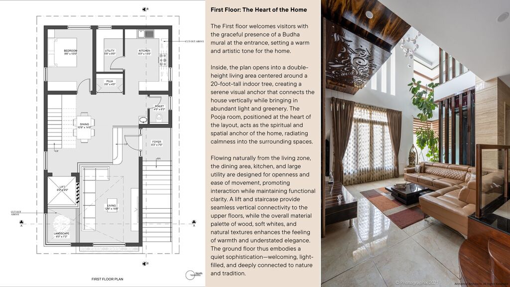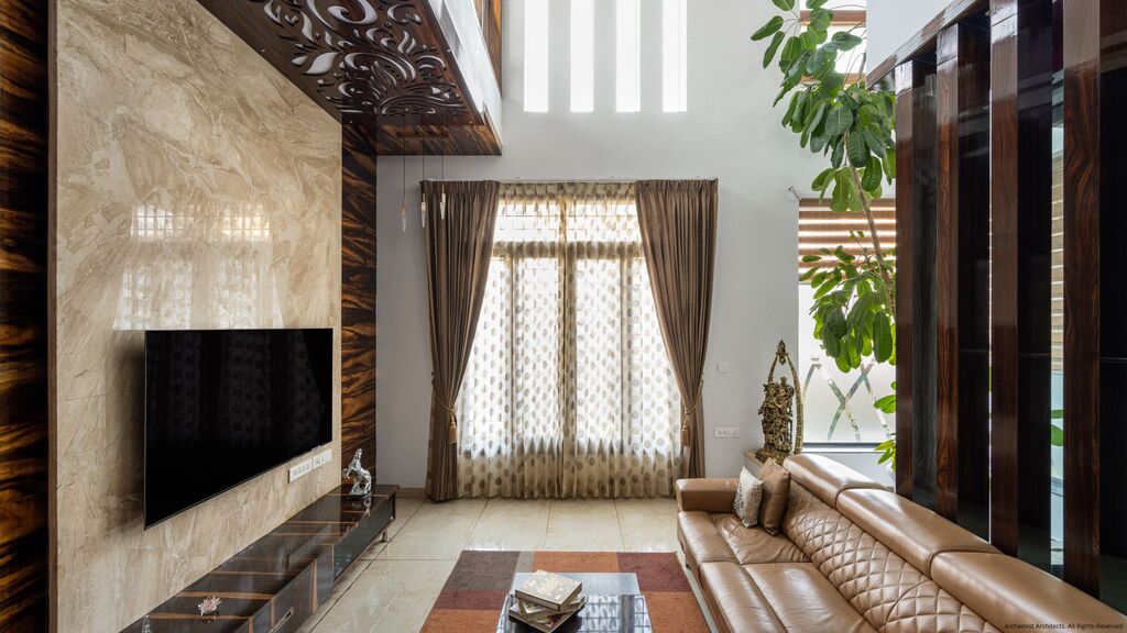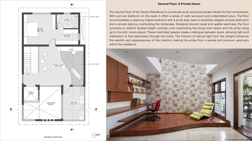 Rather than segregating spaces, the layout revolves around a central double-height volume, allowing visual and verbal connectivity across levels. Family members can interact easily, fostering a sense of togetherness and fluidity.