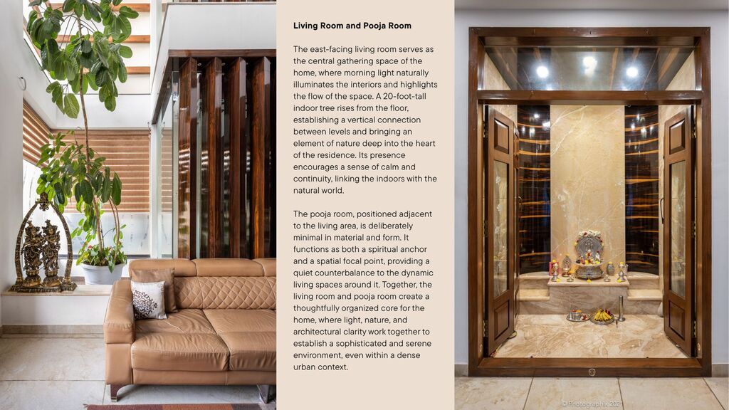Nestled in the dense fabric of Bangalore’s residential core, this 1500 sq. ft. site presented a unique challenge—how to craft a tranquil oasis amidst the city's chaos. With a street-facing east side and neighboring houses on both east and west, the key design objective was to create a spacious, light-filled home that fosters a sense of calm and well-being.